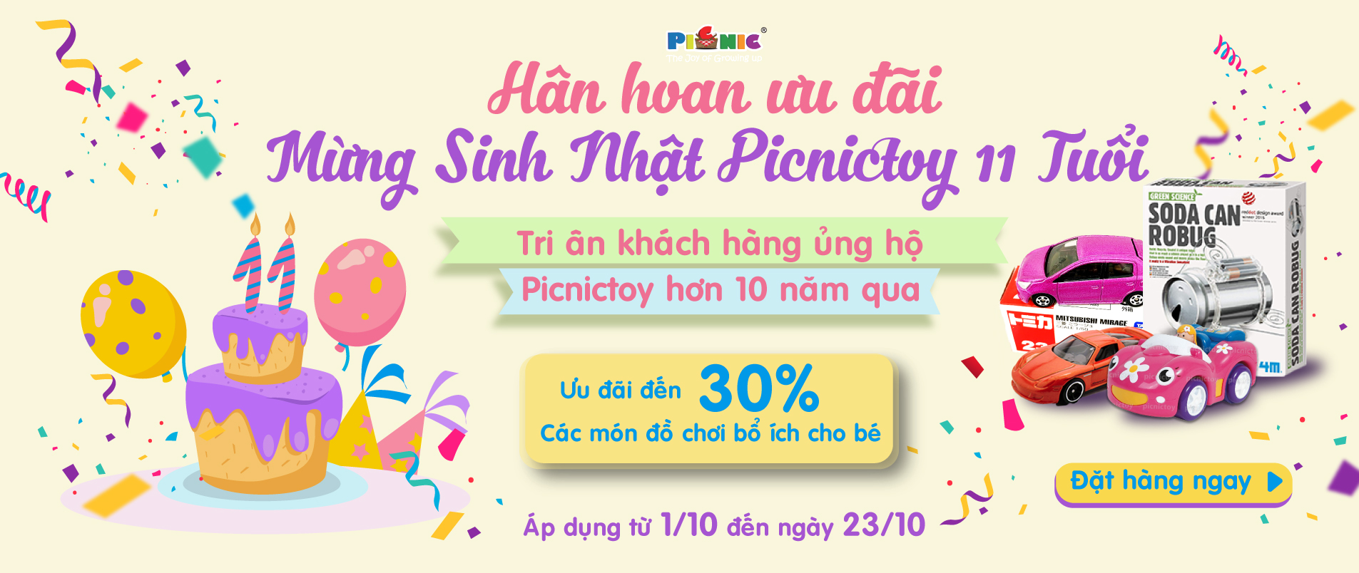 Nhân dịp sinh nhật 11 tuổi, Picnictoy hân hoan gửi đến các Cha Mẹ quà tặng ưu đãi lên đến 30% các món đồ chơi bổ ích. Món quà là lời tri ân chân thành của Picnictoy dành cho sự ủng hộ của các Cha Mẹ trong suốt chặng đường hơn 10 năm qua ![]()